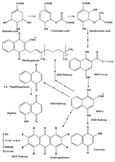 To date, the pathways of the biosynthesis of naphthoquinone pigments with the participation of shikimic acid have been studied in sufficient detail. The shikimate pathway of quinone biosynthesis is best studied by the example of 1,4-naphthoquinone biosynthesis [42,49,50].