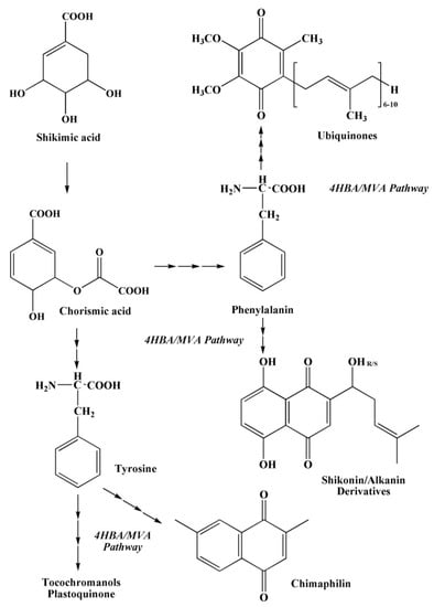 The shikimate pathway is the main one in the biosynthesis of aromatic and colored quinones (naphthoquinones) and unpainted fragments of quinoid compounds in cells (plastoquinone, phylloquinone, menaquinone and ubiquinone) with the formation of shikimic acid [42,49,50].
