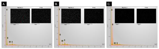 EDS spectra analysis of post-treated CMg (A), CEMg (B), and C (negative control) (C) confirm Mg and P incorporation into membranes via magnesium peak (~1.3 keV) and phosphorus peak (~2 keV). Images showing visual mapping of magnesium and phosphorus are included for each respective group and displays uniform distribution. * Note: Images have had saturation and sharpness increased and converted to black and white to improve visualization.