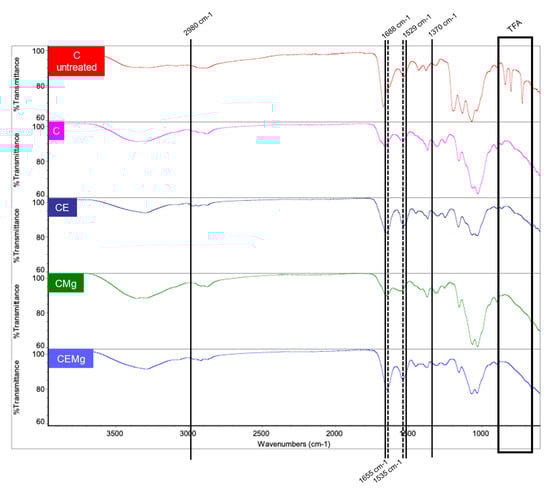 FTIR analysis of untreated C and post-treatment C, CE, CMg, and CEMg membranes is shown in Figure 4. All post-treatment membrane groups lacked peaks at 720, 802, and 837 cm−1 characteristic of trifluoroacetic acid (TFA) salts, confirming successful salt removal. The elastin-incorporated membranes (CE and CEMg) exhibited FTIR peaks at wavenumbers associated with the elastin amide (1535 and 1655 cm−1) bonds. The presence of these peaks confirms the presence of the elastin in the electrospun membranes.
