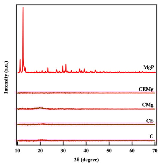 XRD results show strong peak for MgP indicating they are in a highly crystalline structure. Lack of peaks in electrospun C, CE, CMg and CEMg membranes indicate loss of crystallinity of MgP and all membranes had an amorphous chitosan structure.