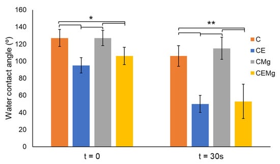 Results of the water contact angle measurements are shown in Figure 6. Results indicated that all membrane groups were initially hydrophobic with contact angles greater than 90°. After 30 s, the water contact angles of the elastin-containing membranes decreased to angles much less than 90° as compared to the non-elastin-containing membranes. Statistical analysis showed that CE was significantly different than C (p = 0.003, p = 3 × 10−15) and CMg membranes (p = 0.0016, p = 7 × 10−8) at t = 0 s and at t = 30 s, respectively. Similarly, CEMg showed significant differences compared to C (p = 0.0094, p = 2 × 10−5) and CMg (p = 0.005, p = 2 × 10−6) at t = 0 s and t = 30 s, respectively.
