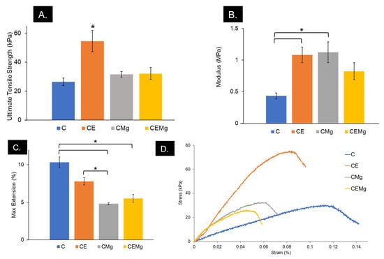 CE membranes had the highest ultimate tensile strength (kPa) (A). CE and CMg saw increased Young’s moduli (MPa) (B). The addition of elastin, MgP, or both decreased maximum extension (C) of membranes. * denotes significant difference (p < 0.05). Representative stress–strain curves of all membranes (D).