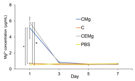 Magnesium release (n = 3/group) peaked on day 1 for CMg and CEMg groups with minimal release on subsequent timepoints and negative controls (C and PBS). * denotes significant difference (p < 0.05). # denotes significant difference (p < 0.01).