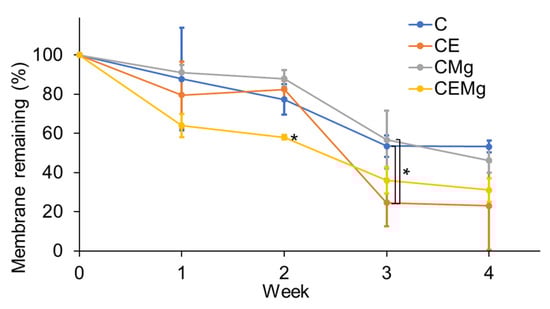 Statistical analysis using a two-factor ANOVA showed significant differences in membrane degradation between groups (p = 3 × 10−6), over time (p = 1 × 10−16), and that there was a significant interaction between membrane groups and time (p = 0.028). One-factor ANOVA within each timepoint was conducted and found that at week 2, CEMg was significantly different compared to C (p = 0.007), CE (p = 0.0014), and CMg (p = 0.00037) sample groups. Furthermore, at week 3, CE was found to be different compared to C (p = 0.039) and CMg (p = 0.023). No differences were found at weeks 1 and 4.
