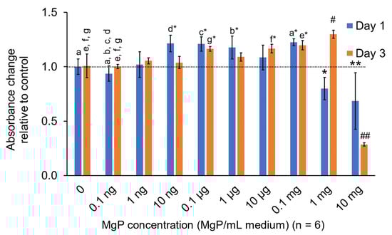 Absorbance from cytotoxicity assay after cell exposure to MgP-doped media for 24 and 72 h showed cytotoxicity beginning near 1 mg/mL–10 mg/mL (MgP/mL media). Data is normalized to media blank with no MgP (0 MgP/mL medium). Higher absorbance is associated with a higher cell count. a*–g* indicates a significant difference (p < 0.05) to all groups with matching letters (a–g). * indicates a significant difference (p < 0.01) to all groups except 0, 0.1 ng, and 1 ng MgP/mL medium within day 1. # indicates a significant difference (p < 0.001) to all groups except 0.1 mg, 10 μg, 0.1 μg MgP/mL medium within day 3. ** indicates a significant difference (p < 0.01) to all groups except 1 mg MgP/mL medium within day 1. ## indicates a significant difference (p < 1 × 10−10) to all groups within day 3.