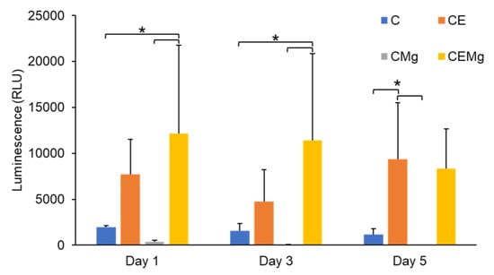Luminescence of eluants collected at days 1, 3, and 5 from NIH3T3 fibroblasts on membranes showed increased cytocompatibility in CE and CEMg membranes. Luminescence is indicative of increased cell count. * denotes significant difference (p < 0.05).