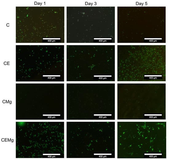 Overall, elastin incorporation improved the biocompatibility of ESCMs with fibroblasts. CE and CEMg membranes, exhibited the best proliferation rates highlighting the beneficial effects of elastin in supporting cell attachment and growth. This decreased hydrophobicity may be attractive to the fibroblasts, whereas extremely hydrophobic materials (like C and CMg) are not [55,56]. The immunofluorescence images of CE and CEMg showed differences in cell morphology, notably increased cell spreading, that may be attributed to elastin [57,58]. It should be noted that although the CMg membrane had the lowest cytocompatibility, the presence of MgP did not deter the CEMg membranes’ cytocompatibility.