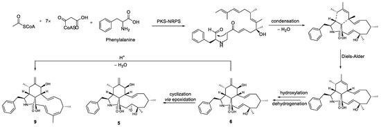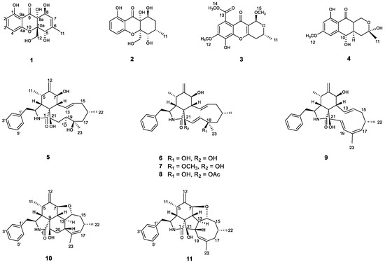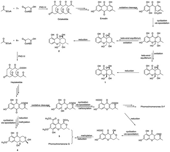 A plausible biosynthesis of compounds 1–11 was proposed, as shown in Scheme 1 and Scheme 2. More than 4000 chromones have been isolated and structurally elucidated from natural origin until now, and they are biosynthesized by the type III polyketide synthases (PKSs) [54]. Compounds 1 and 2 isolated from P. asparagi DHS-48 are assumed to be derived from one acetyl-CoA starter and seven molecules of malonyl-CoA extender units to form an octaketide that undergoes Claisen condensation and cyclization to yield anthraquinone precursors such as emodin, even though it was not isolated in this study. Oxidative cleavage, cyclization via epoxidation, and nucleophilic attack by a hydroxyl group to give the ring-closed dihydroxanthone involved the epimerization of C-10a. The subsequent keto–enol equilibrium and redox would provide compounds 1 and 2, referring to the reports made by Rönsberg et al. [55]. Previous feeding experiments with sodium 13C-labeled acetate by Lösgen et al. [56] in 2007 revealed that a heptaketide precursor is involved in the biosynthesis of 3 and 4, which are analogues to phomochromenones D-G isolated in our previous study [46], implying some cryptic post-synthesis modification genes were stimulated by the currently adopted epigenetic manipulation for the production of those metabolites previously unobserved or merely increased sufficiently under epigenetic control to be detected. Cytochalasins 5–11 might rationally share a common biosynthetic precursor as we previously described via polyketide synthase (PKS)/nonribosomal peptide synthetase (NRPS) hybrid machinery [38]. The stimulated metabolite 5 was is likely to be also derived from 6 by epoxidation, meanwhile 9 feasibly converted through catalytic dehydration.