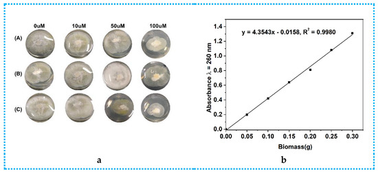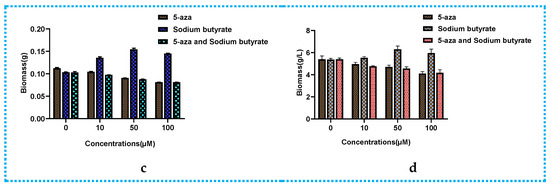 Comparison of colony growth, dry biomass (in PDA and PDB) of Phomopsis asparagi DHS-48 in the presence of different concentrations (0, 10, 50, 100 µM) of 5-aza, sodium butyrate, and the combination of these inhibitors: (a) colony growth. In (A), 5-aza was added; in (B), sodium butyrate was added; in (C), the combination of these inhibitors was added; (b) calibration graph for calculating dry biomass based on nucleic acid contents with different epigenetic doses in PDA; (c) the dry biomass of fungi cultivated in PDA with different epigenetic doses; (d) the dry biomass of fungi cultivated in PDB with different epigenetic doses.