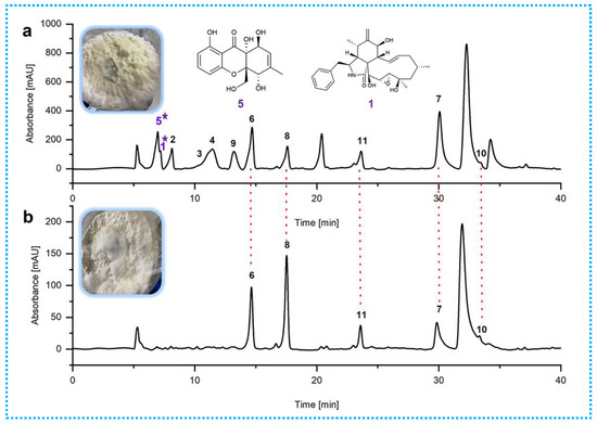 HPLC profiles of fungal EtOAc extracts (a) obtained from rice solid-substrate medium after 50 µM sodium butyrate treatment and (b) obtained from rice solid-substrate medium without epigenetic inhibitor treatment. HPLC chromatograms: C18 column (Agilent Technologies 10 mm × 250 mm). Solvents: A, H2O; B, MeOH. Linear gradient: 0 min, 60% B; 40 min, 100% B. Temperature 25 °C. Flow rate 2 mL/min. UV detection at λ = 210 nm. Peaks 1–11 represent the isolated metabolites. ★ Compounds 1 and 5 in (a) represent the new compounds stimulated by epigenetic manipulation.