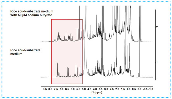 The EtOAc extracts of the mycelia and solid rice medium incubated with 50 µM sodium butyrate were subjected to HPLC analyses. By comparing with the blank control (Figure 3 and Figure S45), the production levels of the known metabolites 6–8, 10, and 11 were considerably enhanced in the sodium-butyrate-inhibited fermentation at the same injection concentration. In addition, certain peaks of 1–5 and 9 appear to be present in the chromatograms from the 50 µM HDAC inhibitor that are absent in the control group. Continuously, these differences were also supported by the fact that the 1H NMR metabolic profile (Figure 4) of EtOAc extracts showed several additional significant hydrogen resonances between 5.5 and 8.0 ppm, compared with the control group.