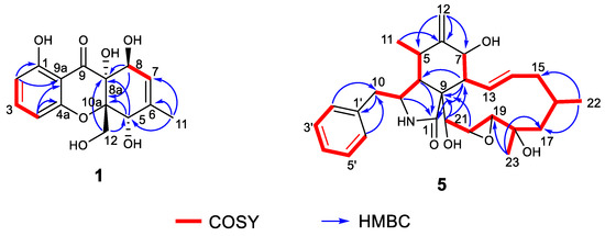 Key COSY and HMBC correlations of Compounds 1 and 5.