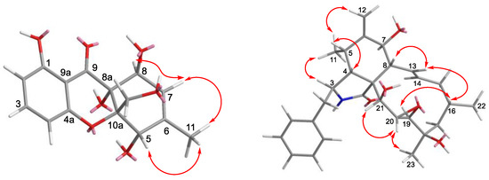 Phaseolorin J (1) was isolated as a light yellow amorphous powder. Its molecular formula was determined as C15H16O7 on the basis of HRESIMS data (m/z 331.0781 [M + Na] +, calcd for C15H16O7 Na 331.0788), which clearly indicated the presence of eight indices of unsaturation. The 1H and 13C NMR data of 1 (Table 1) and its 1H-1H COSY and HSQC spectra showed the presence of a series of characteristic signals for a 1,2,3-trisubstituted benzene ring (δH 6.43 (d, J = 8.2 Hz), δC 109.3, d, CH-2; δH 7.38 (t, J = 8.2 Hz), δC 138.9, d, CH-3; δH 6.52 (d, J = 8.2 Hz), δC 108.7, d, CH-4), one olefinic methine of a trisubstituted double bond (δH 5.61 (dq, J = 4.8, 1.7 Hz); δC 122.3, d, CH-7), a tertiary methyl (δH 1.86, 3H, d, 1.7; δC 19.2, q, CH3–11), an oxygenated methylene (δH 4.12, (d, J = 13.2 Hz), δH 4.03 (d, J = 13.2 Hz); δC 64.1, t, CH2-12), and two oxygenated methines (δH 4.69, 1H, br s, δC 74.5, d, CH-5; 4.55, 1H, d, J = 4.8 Hz, δC 67.9, d, CH-8). The magnitude of the 1H-1H COSY spectrum led to the observation of long-range correlations, including the assignments of vicinal coupling with H-5 and proton H-7 on the cis-substituted double bond, as well as homoallylic couplings with H-8 and CH3-11. A comparison of the 1H and 13C NMR data of 1 with those of phaseolorin D (2) [52] revealed that both had the same chromone core, except for the presence of one trisubstituted double bond at C-6 (δ 140.5) and C-7 (δ 122.3) instead of sp3 methine (C-6) and sp3 methylene (C-7) in 2. Confirming evidence was obtained from the 1H-1H COSY correlation from olefinic proton (δH 5.61, H-7) to the oxygenated methine (δH 4.69, H-8) and HMBC correlations from H3-11 to C-5, C-6 and C-7 (Figure 5).