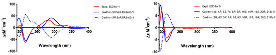 Experimental and calculated electronic circular dichroism (ECD) spectra of 1 and 5.