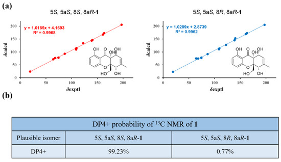 13C NMR calculation results of two plausible epimers (1 and 8-epi-1) at the B3LYP/6-31G(d) level: (a) linear correlation plots of calculated and experimental 13C values; (b) DP4+ probability of 13C values of 1.