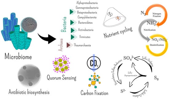 Betaproteobacteria and Campylobacterota, which were found in association with the sponge Neamphius huxleyi, were not found in seawater, despite the fact that Proteobacteria were the most prevalent bacteria in deep-sea water, thus highlighting the occurrence of sponge-specific lineages [169]. Furthermore, prokaryotes appeared to be strongly involved in nitrogen cycling (e.g., Proteobacteria, Thaumarchaeota and Actinomycetales) and CO2 fixation (e.g., Proteobacteria, Bacteroidetes, and Acidobacteria). More recently, the study of the prokaryotic diversity in the sponge species Geodia barretti, Stryphnus fortis, and Weberella bursa, was carried out on specimens collected along a depth gradient ranging from 244 to 1476 m [15]. The different water masses (across meso- and bathypelagic depths) had a major impact in the structuring of sponge-associated prokaryotic communities. In contrast with the compositional stability at phylum level, variations were observed at amplicon sequence variant (ASV) level, as evidence for a selective process for the required taxa from the environment.
