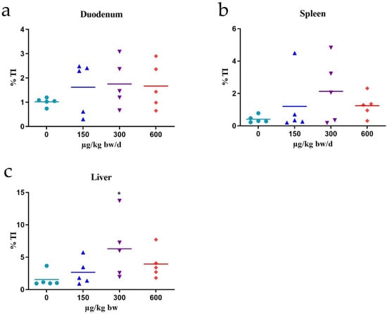 C17-SAMT induced an increase in DNA tail intensity at all doses in the spleen and duodenum compared to the negative control, although not statistically significant (Figure 2). In the liver, a statistically significant increase in the percentage of tail DNA was observed at the mid dose of 300 µg/kg b.w, whereas for the low and the high dose, the %TI was increased but not statistically significant due to value dispersion (Figure 2).