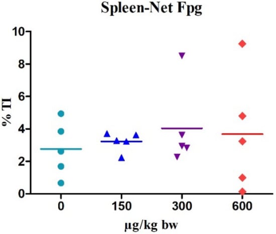 When the ability of cells to eliminate and repair damage is compromised by excessive production of Reactive Oxygen Species ROS, macromolecules (DNA, lipids, and proteins) are oxidized []. However, the classical comet assay is generally not sensitive enough to detect DNA oxidative bases, and the addition of enzymes such as Fpg and OGG1 is required []. Nevertheless, in our study, the Fpg-modified comet assay in the spleen did not reveal any increase in DNA oxidative bases after oral exposure to C17-SAMT.