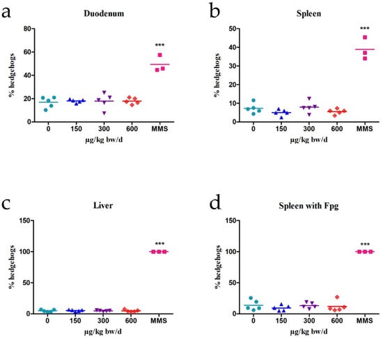 Individual results of hedgehogs’ frequency (five animals/group) obtained with the comet assay in different tissues and with the Fpg-modified comet assay in the spleen after 3-day oral administration of different doses of C17-SAMT (0—saline solution, 150, 300, and 600 µg/kg b.w.). MMS treatment was used for the positive control group. Lines indicate mean of % hedgehogs per group. (a): duodenum, (b): spleen, (c): liver, and (d): spleen with Fpg. *** p < 0.001.