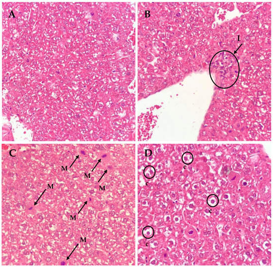 Examples of histopathological abnormalities observed in the liver from mice treated with three oral doses of C17-SAMT at 150 µg/kg b.w (B–D) compared to the negative control group (A). I: inflammatory infiltrate; M: mitosis; c: cytoplasm clarification. (Magnification ×40).