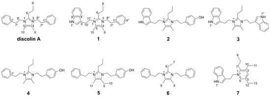 In our continuous search for new bioactive molecules, the six new imidazolium-containing alkaloids discolins C–H (1–6) and one pyridinium-containing alkaloid dispyridine A (7) were isolated from the marine-derived bacterium T. discolor sv11 (Figure 1). The antimicrobial activity of these new compounds was investigated, among which, compounds 1 and 3 exhibited moderate activity against Gram-positive Bacillus subtilis DSM10, Mycobacterium smegmatis ATCC607, Listeria monocytogenes DSM20600 and Staphylococcus aureus ATCC25923. In vivo and in vitro experiments indicated that phenethylamine, tryptamine and tyramine residues of the new alkaloids are derived from an enzymatic decarboxylation.