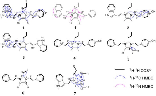Key HMBC and 1H-1H COSY correlations of compounds 1–7.