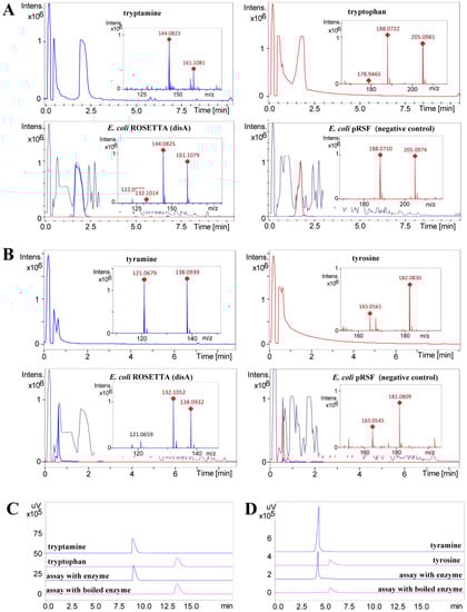 Based on previous research, it was known that phenylalanine can be converted to phenethylamine by the catalytic action of the decarboxylase DisA. This molecule could serve as building block to yield different derivatives []. Hence, the newly isolated imidazolium-containing alkaloids (1–6) were also supposed to be produced via the same biosynthetic route, i.e., first an enzymatic decarboxylation of the aromatic-L-amino acid tryptophan or tyrosine yielding tryptamine or tyramine, respectively, followed by a non-enzymatic condensation to form the central imidazolium ring. To confirm this hypothesis, the candidate enzyme DisA from T. discolor sv11 was analyzed in vivo in a heterologous system. Therefore, the previously constructed transgenic host strain E. coli ROSETTA (disA) carrying the respective disA gene and E. coli ROSETTA (pRSF) (negative empty vector control) were cultivated in LB medium, whereby 2 mM tryptophan and tyrosine were added as substrates, respectively. After 24 h incubation, tryptamine and tyramine were only detected in the extract of E. coli ROSETTA (disA), while only the substrates, i.e., tryptophan and tyrosine were detected in the negative control (Figure 3). To further validate these results, a His-tagged version of DisA was purified using affinity chromatography and assayed in vitro. This confirmed that tryptamine and tyramine can be obtained from tryptophan and tyrosine by a DisA-dependent catalytic conversion (Figure 3).