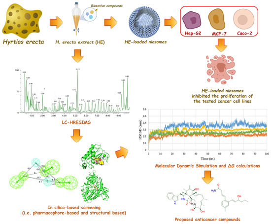 This provoked us to test the ability of the total extract against the three cancer cell lines. Moreover, HR-LCHRMS analysis was carried out for the crude extract to putatively identify its major compounds. Subsequently, these compounds were subjected to a number of in-depth in silico investigation to highlight the most probable anticancer compounds. Although marine products are pharmacologically treasured, their optimum use has been hindered due to the high fragile nature of their commodities and rapid deterioration [12]. Therefore, the application of nanotechnology to deliver and target such important compounds is of high interest. Niosomes are vesicular nano-structures that consist of non-ionic surfactants. They are more advantageous than other nanocarriers, such as liposomes, because they are more stable and cost-effective [13]. Moreover, they are biodegradable, biocompatible, flexible in structure, and guarantee the encapsulation of both hydrophobic and hydrophilic active components [14]. These features encourage the loading of HE in niosomes to investigate if its anticancer potential will be enhanced. The findings in this study could be a starting point towards further investigation of HE and its niosomes as a promising source of anticancer agents. The workflow of this study is depicted in Figure 1.