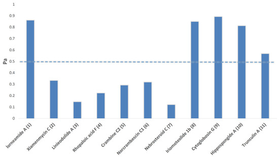 As explained in Figure 3, between the annotated compounds in HE, compounds 1 and 8−11 were suggested to act as antineoplastic agents (i.e., Pa > 0.5). Previously, compound 8 and 11 have been considered as a potent anticancer agents [28,29].