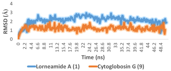 To further validate the docking results of the previous step, we subjected the re-trieved docking pose of each compound to 50 ns MDS experiments. As depicted in Figure 4, both compounds (i.e., 1 and 9) were able to achieve stable bindings over the course of simulation producing low binding deviations in comparison with the initial binding modes (i.e., the docking poses) with average RMSDs of 2.1 and 1.1 Å, respectively. Accordingly, their estimated ΔG were found to be considerably low (i.e., ΔG = −8.4 and −7.6, respectively) indicating good affinity toward each corresponding protein target.