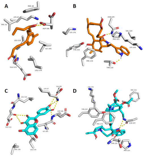 Looking into the binding modes of each compound inside the binding sites of the corresponding proteins at the end of MDS revealed that they were achieved their stable bindings by establishing a number of strong H-bonds (<2.5 Å) and hydrophobic interactions. As shown in Figure 5, compound 1 interacted with GLU-121 and ASP-186 via to hydrogen bonds similarly to the co-crystalized inhibitor, in addition to a number of hydrophobic interactions with LYS-67, LEU-120, LEU-174, and ILE-185. In regard to compound 9, it established two H-bonds with THR-220 and ASN-329 similarly to the co-crystalized ligand, and was also able to interact with PHE-214, LYS-326, and PHE-351. According to the previous in silico and structural findings, both compounds 1 and 9 are likely linked to the anticancer properties of HE.