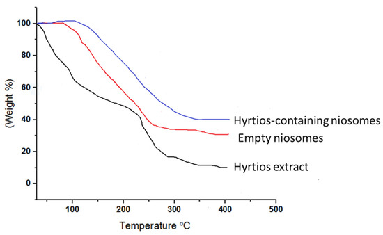 Thermogravimetric analysis declares the enhanced thermal stability of Hyrtios-containing niosomes compared to Hyrtios extract.