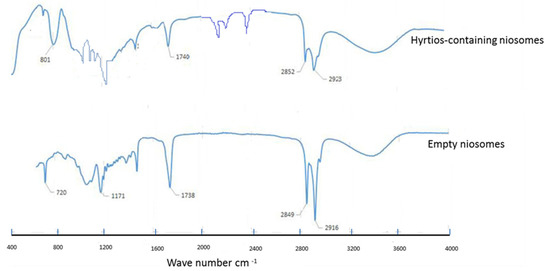 To gain more insight into the possible interactions between the components of both the Hyrtios extract and formulated niosomes, FTIR spectra of empty niosomes, and Hyrtios-containing niosomes were evaluated (Figure 8). The FTIR spectra show similar bands of empty niosomes and Hyrtios- containing niosomes at 2916, 2849, 1738, 1171, and 720 and 2973, 2852, 1740, and 801, respectively. That indicates no developed linkages or interaction have been produced upon encapsulation.