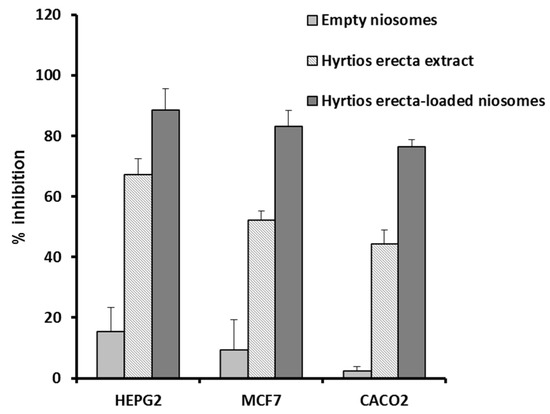 Enhanced inhibition of cellular proliferation of HepG2, MCF7, and Caco-2 cell lines at IC50 HE niosomes compared to the corresponding empty niosomes and of HE extract.