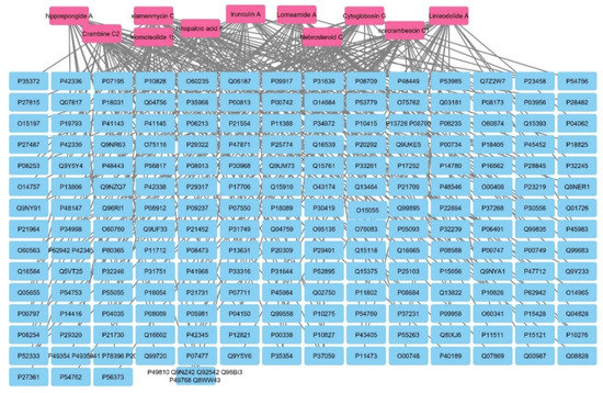Metabolites–all targets network. The pink rectangles represent the active metabolites of Hyrtios erectus sponge extract; the blue rectangles represent all genes (genes are mentioned in Uniprot IDs).