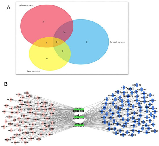 (A) A Venn diagram illustrating the number of intersected genes involved in the three cancer types, breast, colon, and liver, among the identified targets. (B) A network of target genes- major cancers (breast, colon, and liver). Green rectangles represent types of cancers; oval pink shapes represent the intersected genes between the three types of cancers; and oval blue shapes represent genes not involved in the three types of cancers.