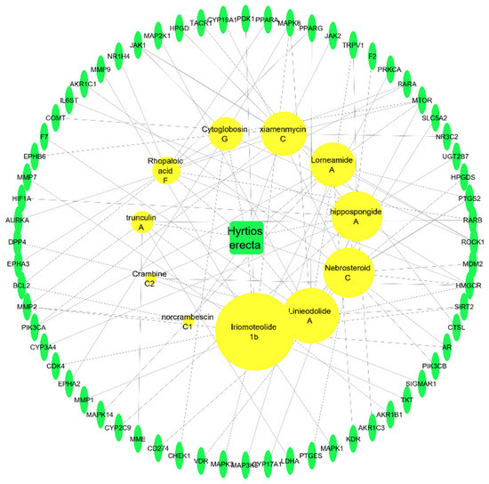 Sponge–metabolite–intersected cancer genes network, which is a network between the active metabolites of Hyrtios erectus and the intersected genes. Yellow circles represent the active metabolites (the larger the circle, the more edges); the green oval shapes represent the intersected genes among the three types of cancer.