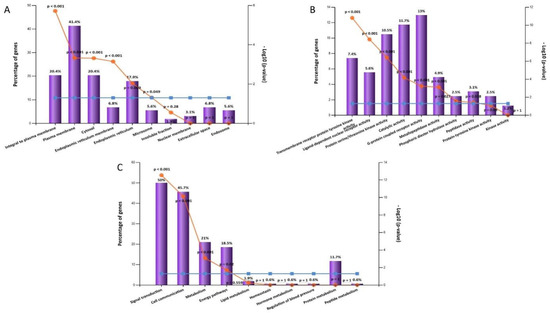 Gene enrichment analysis of target genes of H. erectus active metabolites showing (A) cellular components, (B) molecular functions, and (C) biological processes.
