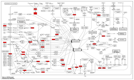 KEGG illustrating diagram of biological pathways showing the pathway in cancer as the top pathway and evolved direct and indirect genes (AR, BCL-2, CDK4, COX-2, CDK 4/6, ERK, F2, HIF-α, HZFRAR-α, HMRAR-α, JNK, JAC, MEK, MMPs, ROCK, P13K, RARβ, PKC, PPFP, PPARy).