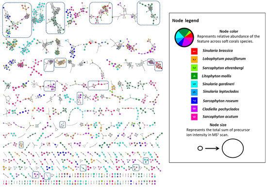 Analogously, our primary aim was to explore and highlight the metabolic biodiversity offered by common Egyptian soft corals with the aid of untargeted metabolomics. Furthermore, species-specific metabolites have been highlighted for the future prioritization of soft coral species for MS-guided chemical investigation. Specimens studied included three Sinularia species (Si. brassica (formerly known as Si. dura), Si. leptoclados, and Si. gardineri), three Sarcophyton species (Sa. roseum (formerly known as Sa. convolutum), Sa. ehrenbergi, and Sa. acutum), along with Cladiella pachyclados, Litophyton mollis (formerly known as Nephthea mollis) and Lobophytum pauciflorum. Molecular networking was consulted to visually dissect the chemical similarities and differences among the specimens through the GNPS platform based on tandem mass spectrometric data (HRMS/MS).