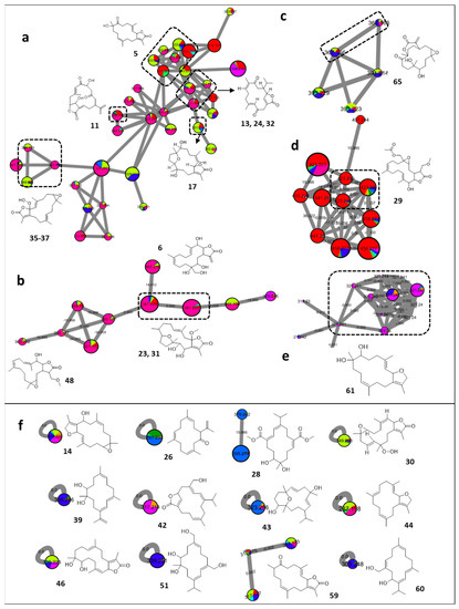 Annotated cembrane diterpenes and their distribution in the FBMN. Node color corresponds to color codes described in Figure 1.