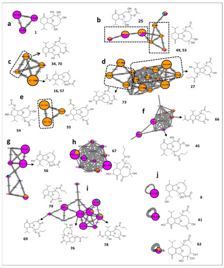 Application of the same strategy on the single nodes also led to the tentative assignment of multiple singletons belonging to Cladiella pachyclados, as hirsutalin G [54] (9, m/z 379.2476 [M + H]+, C22H34O5), klymollin S [55] (41, m/z 379.2474 [M + H]+, C22H34O5), and sclerophytin C [43] (62, m/z 397.2579 [M + H]+, C22H36O6) (Figure 4j).