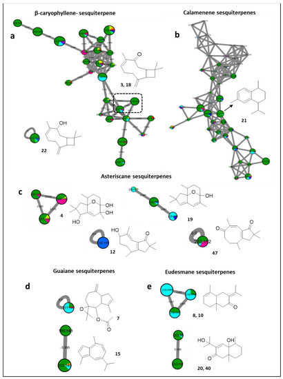 Annotated sesquiterpenes and their distribution in the FBMN. Node color corresponds to color codes described in Figure 1.