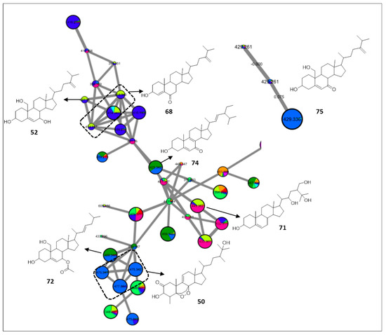 The FBMN unearthed the presence of oxysterols in almost all specimens with a typical fragmentation pattern of successive loss of H2O and subsequent loss of the side chain. A major cluster of oxysterols was proposed with prevalence in Lobophytum pauciflorum, and consisted of an epidioxy ergosterol analogue [67] (50, m/z 475.3415 [M + H]+, C29H46O5), previously characterized from Sinularia candidula, nephalsterol B [68] (52, m/z 431.351 [M + H]+, C28H46O3), isomers of hydroxyergostadiene-one [69] (68, m/z 413.3405 [M + H]+, C28H44O2), sarcrasterol [70] (71, m/z 449.3616 [M + H]+, C28H48O4), erectasteroid D [71] (72, m/z 459.3462 [M + H]+, C29H46O4), and hydroxystigmastatrienone [72] (74, m/z 425.3407 [M + H]+, C29H44O2) (Figure 6). The cluster suggested the presence of possible new oxysterol scaffolds with mass differences from the annotated ones of 16 or 17 Da, implying further hydroxylation or hydroperoxylation.