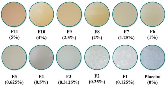 Figure 1 and Table 2 present the color changes in hydrolyzed shark cartilage (HSC), lyophilized hydrolyzed shark cartilage (LHSC), and shark cartilage gel. The color of the liquid hydrolyzed P. glauca (HSC) was yellowish (L* = 5.43 ± 0.05; a* = −0.16 ± 0.14; b* = 21.07 ± 0.04). After being lyophilized, the liquid turned into a white solid mass form, it was spongy, and some parts turned into yellowish, transparent, thin layers. After being grounded, the LHSC was a sparkly white powder (L* = 53.87 ± 0.11; a* = −2.43 ± 0.08; b* = 8.45 ± 0.14) in color. Meanwhile, the prepared base was transparent, and the formulations were yellowish due to the presence of shark cartilage (Figure 1). The L* value decreased as the addition of LHSC increased. A higher concentration of shark cartilage caused changes in color, becoming more yellow and opaquer.