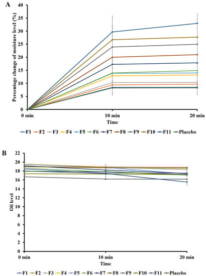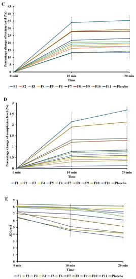 Figure 2 presents the skin properties’ analysis after the LHSC formulations were applied for 10–20 min. Figure 2A,C,D show upward trends in moisture, texture, and complexion, whereas oil secretion (Figure 2B) and the 3D level (Figure 2E) exhibited downward trends. Sample F11 improved the moisture, texture, and complexion of the skin. Sample F11 also significantly controlled oil secretion; meanwhile, the 3D structure was enhanced and the wrinkles smoothed after the F11 sample was applied for 10 and 20 min. Human skin is composed of epidermal and dermal layers. Collagen and elastin are present in the dermal layer to form the skin structure. The dermal layer receives fewer nutrients with age and aging damages the elasticity of the skin, as shown by the fragility of the collagen bundles [30]. Participants supplemented with 10 g of hydrolyzed Pangasius hypophthalmus collagen powder dissolved in 100 mL of water daily in the morning had improved wrinkle scores on both sides of the face and cheeks, improved skin hydration, and self-reported good elasticity, radiance, hydration, firmness, and wrinkle scores [30]. Due to the positive effect on the quality and functionality of the skin, it is possible to apply the cosmetic gel formulation with P. glauca collagen hydrolysate, which also indicates the biocompatibility with the skin and the biodegradability of the formulation.