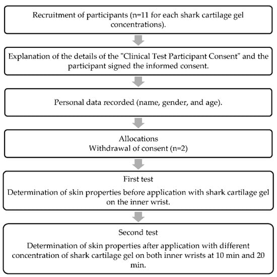 Figure 3 presents the experimental design for the effect of lyophilized hydrolyzed shark cartilage (LHSC) on skin health. Dried P. glauca cartilage was obtained from Pang-Ho Trading Co. The preparation of shark cartilage extract followed the method described by Li et al. [40] with modifications. The dried cartilage was washed with potable water and cut into small pieces before the collagen was isolated. The entire process of collagen isolation was performed at 4 °C. The cartilage was homogenized in a tissue homogenizer with phosphate buffer at pH 6.5 (0.2 mol/L sodium dihydrogen phosphate and 0.2 mol/L disodium hydrogen phosphate heptahydrate). The homogenate was treated with distilled water at a ratio of 1:5 (w/v) for 24 h to remove water-soluble substances. After centrifugation at 9000 rpm for 30 min, the pellet (cartilage samples) was decalcified with 0.3 M EDTA (pH 7.4) at a ratio of 1:10 (w/v) for 48 h. The solution was replaced every 12 h by centrifuging at 9000 rpm for 30 min to separate the supernatant and pellets. Next, the precipitate (pretreated shark cartilage) which was obtained by centrifugation at 9000 rpm for 30 min was soaked in 0.5 M acetic acid containing 1% pepsin (1:5, w/v) for 48 h with continuous shaking, and the extracts were centrifuged at 9000 rpm for 30 min at 4 °C. The supernatant was collected and salted out by adding 2 M sodium chloride (NaCl). The precipitate was obtained by centrifugation at 9000 rpm for 30 min. The precipitate was the hydrolyzed shark cartilage (HSC). The HSC crude collagen was then dissolved in 0.5 M acetic acid and dialyzed using a dialysis tube (Cellulose Membrane, D9777-100FT) with a typical molecular weight cut-off of 14 kDa, against 0.1 M acetic acid, followed by deionized water for 3 days. Before handling, the purified hydrolyzed P. glauca cartilage was stored at −20 °C. The HSC was weighed, the mass was recorded, and 30 mL was distributed to 50 mL falcon tubes; the samples were freeze-dried (FDM-5, UNISS, Taiwan) for 48 h. The LHSC was collected and weighed, and the percent yield was determined using the equation below. The lyophilized product was stored at −20 °C for further studies.