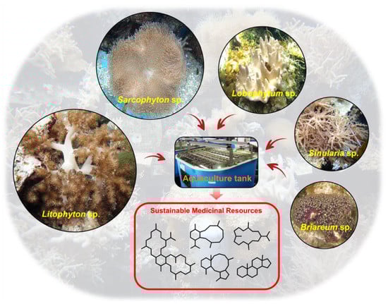 Nature has contributed to all aspects of drug discovery and development through the production of secondary metabolites with diverse chemical structures and biological activities. In addition to terrestrial plants and animals, marine organisms are considered a prolific resource of highly potent compounds. Although occupying 70% of the earth surface, only less than 5% of deep-sea organisms have been studied [1], which opens an enormous opportunity for marine drug discovery, especially with the assistance of newly developed specialized techniques and equipment. Among marine organisms, soft corals are marine animals that belong to the order Alcyonacea. Thousands of secondary metabolites have been isolated from soft corals with a wide range of biological activities, such as antibacterial, antitumor, anti-inflammatory, antifungal, antiviral, antioxidant, antiallergic, and antimalarial activities [2]. However, the interesting compounds are usually extracted in very low amounts. Once a compound is isolated and identified as a potent therapeutic agent by in vitro or in vivo assays, a kilogram-scale amount could be required for further clinical investigations and even for commercial supply. The need for these large amounts urges the development of large-scale and sustainable techniques to maintain a consistent supply of potent marine secondary metabolites for drug development.