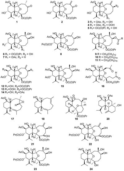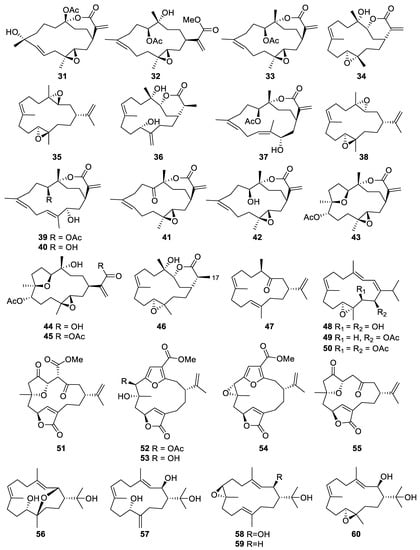 Cembrane-type diterpenes or cembranoids (Figure 4, Figure 5 and Figure 6) are a large group of natural products that possess a 14-member carbocyclic ring derived from the cyclization of geranylgeranyl pyrophosphate and carry diverse functional groups, such as lactone, epoxide, furan, ester, aldehyde, hydroxyl, and carboxyl moieties [14].